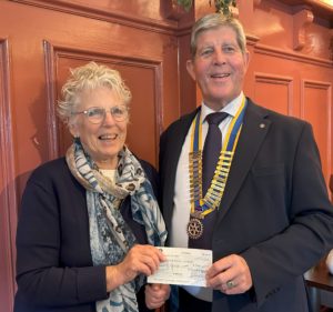 Wimborne Rotary President, Brian Dryden, presenting Jenny with the donation of £500 saying, “I am pleased to hand over this donation in recognition of the support which the Friends have given both to the hospital and, in turn, to the wider Wimborne community.
